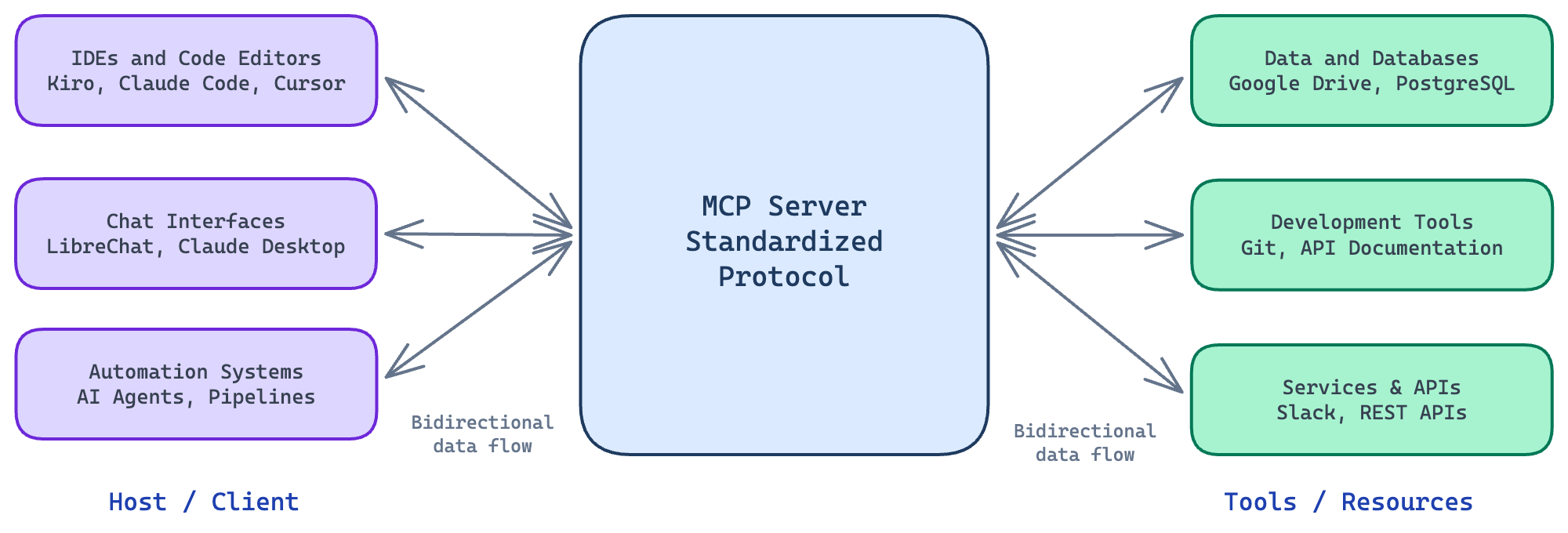 - Host / Client: The application running the AI agent, like IDEs, assistants, and automation systems.