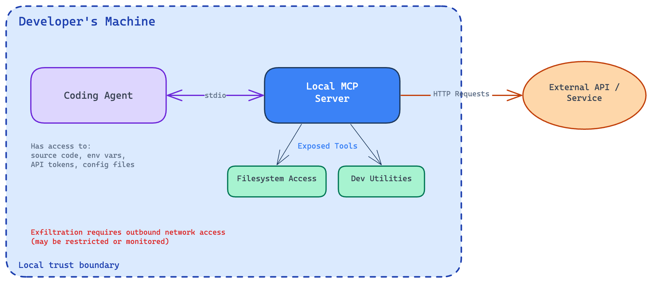 A malicious local MCP server can access sensitive resources—source code, configuration files, environment variables, API tokens—but it still needs a way to exfiltrate data from the developer’s machine. This usually requires outbound network communication, which may be restricted or monitored.