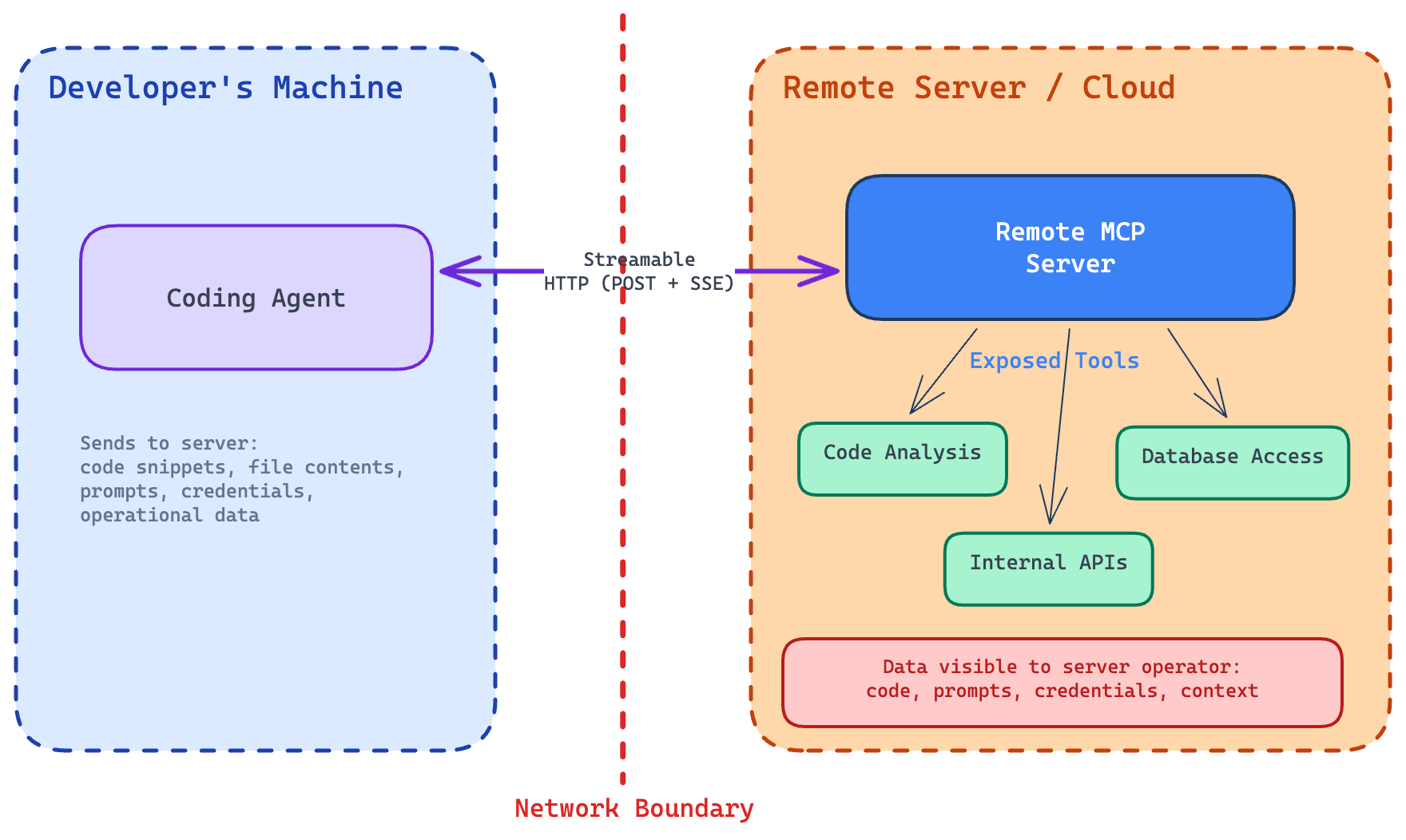 For this reason, remote servers pose a higher direct risk. Developers must trust the server operator because the server can receive sensitive context from the agent, including code snippets, file contents, prompts, credentials, or other operational data.