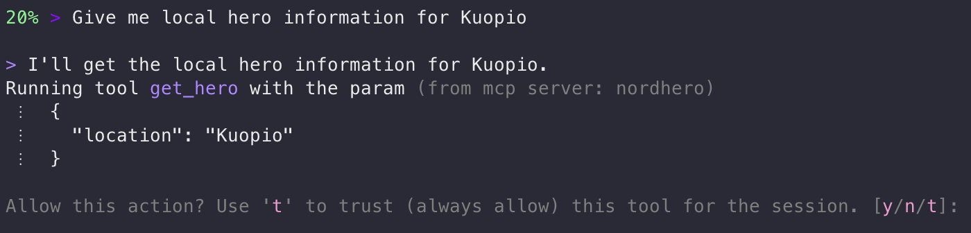 As you can see, Kiro asks for permission to use the tool. If I select the trust option, the tool will be allowed for the whole session, and no further questions will be asked. I also see the parameters that will be passed for the tool. I’m acting as the security control layer—it’s also called the human-in-the-loop model. Naturally, of autonomous agents running, for example, on Amazon Bedrock AgentCore, this is different. The agent may run continuously and automatically invoke tools. This means the security model must rely on policy, sandboxing, and restricted tool design instead of manual approval. Let’s answer with y(es):